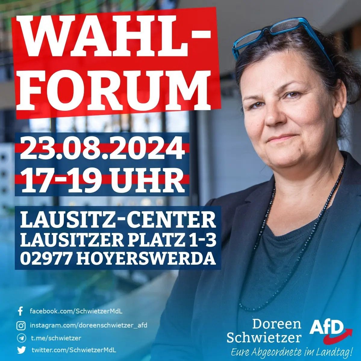 Am Freitag, den 23.08.2024 lade ich euch recht herzlich zum Wahlforum in Hoyerswerda ein! Organisiert wird die Veranstaltung von der Sächsischen Landeszentrale für politische Bildung in Zusammenarbeit mit der Sächsischen Zeitung, der Leipziger Volkszeitung und den Volkshochschulen in Sachsen. Die Diskussion soll sich um Themen wie Fachkräftemangel, Sicherheit, Zuwanderung, Finanzen oder das gesellschaftliche Klima in Sachsen drehen. Kurz und knapp müssen sich die Kandidaten in den Blitzrunden zu politischen Fragen positionieren. Alle Zuschauer sind eingeladen, sich mit eigenen Fragen und Anliegen aktiv an der Diskussion zu beteiligen und mitzubestimmen, über welche Inhalte diskutiert wird. Der Eintritt ist frei, es ist keine Voranmeldung nötig.