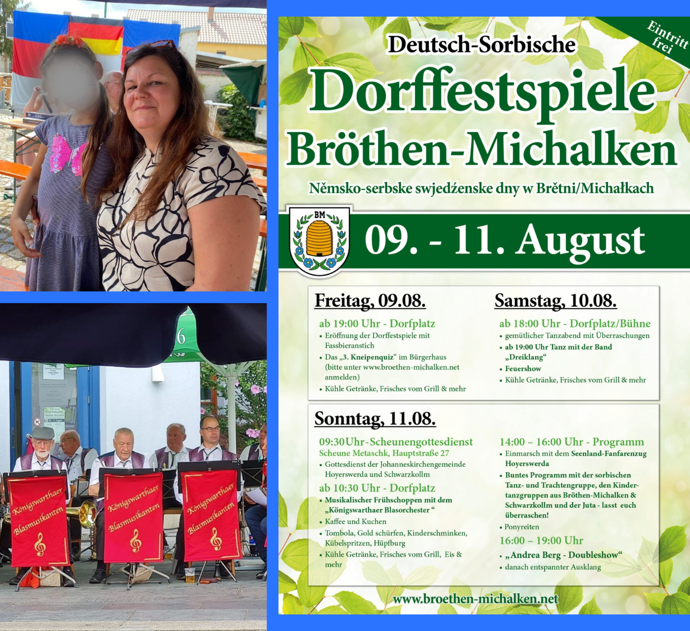 Samstag ging es ab 20 Uhr los und ich konnte bei den Dorffestspielen dabei sein. Es wurde bei tollen Gesprächen das Tanzbein geschwungen, wo auch die Annemarie Bestandteil war. Sonntag früh um 9:30 Uhr ging es zum Scheunengottesdienst der Johanneskirchengemeinde Hoyerswerda und Schwarzkollm und danach freute ich mich zu sehen, wie unsere Kleinsten die Hüpfburg des NATZ e.V. Hoyerswerda nutzten, sich über das vom Dorfklub organisierte Goldschürfen freuten, oder das vom Reiterhof veranstaltete Pony-/Pferdereiten für sich entdeckten. Wie ihr unter anderem auf dem Video sehen könnt, wurde früh den Klängen des Königswarthaer Blasorchester beim Frühschoppen gelauscht und nachmittags wurde das komplette Festprogramm natürlich mit der sorbischen Tanz- und Trachtengruppe untermalt. Ein schönes Fest in unserer Region, wo die deutsch-sorbische Tradition nicht zu kurz kam. Ich freue mich schon auf das nächste Jahr!