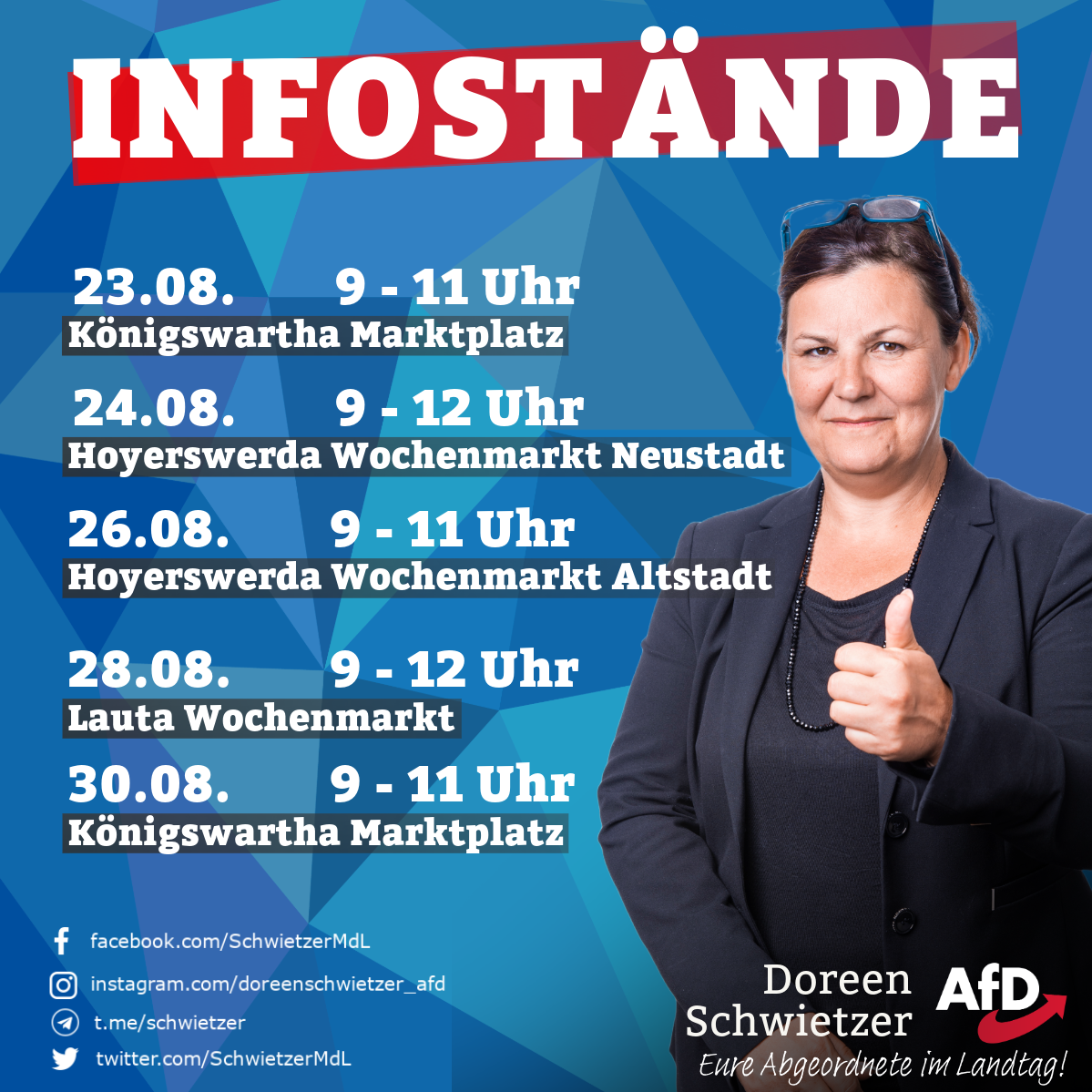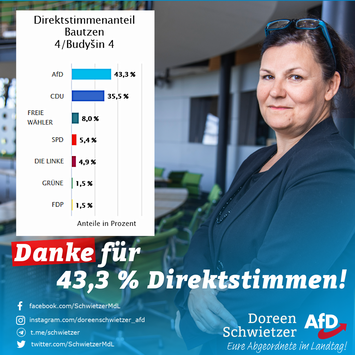 Was hat Sie motiviert, für den Landtag zu kandidieren? Doreen Schwietzer: Da anzuknüpfen, wo ich in der 7. Legislaturperiode aufgehört habe. In vielen Bereichen sehe ich die Notwendigkeit eines Politikwechsels. Wie stehen Sie zu den Ideen der Innenministerkonferenz, die Zuwanderung zu begrenzen? Doreen Schwietzer: Nicht nur reden, sondern handeln. Es müssen komplett andere Gesetze her. Es werden Leute abgeschoben, welche in Arbeit sind oder die Kinder hervorragende Schüler sind oder welche wirklich Schutz benötigen. Geduldet werden Straftäter und es werden falsche soziale Anreize geschaffen – Bürgergeld. Was sind Ihre Ideen für die Belebung der Innenstädte, des ländlichen Raumes und eines funktionierenden ÖPNV auf dem Land? Doreen Schwietzer: Mehr Sicherheit in den Innenstädten. Im ländlichen Raum muss die Infrastruktur dringend ausgebaut werden – Schnellstraße oder eine Autobahnanbindung zur nächsten Großstadt. Es kann nicht sein, dass man zwei bis dreimal umsteigen muss, wenn man zum Beispiel nach Berlin möchte und vier Stunden unterwegs ist. Der ÖPNV funktioniert bei den Bussen gut, nur bei der Bahn fallen öfter Züge aus. So etwas ist inakzeptabel. Das Land Sachsen greift den klammen Kommunen für zwei Jahre in der Not übergangsmäßig unter die Arme. Was aber kommt danach? Doreen Schwietzer: Die Gelder werden mit vollen Händen ausgegeben, damit muss Schluss sein. Das ist nur ein Tropfen auf den heißen Stein. Ich gehe davon aus, dass man damit den klammen Kommunen nicht dauerhaft helfen kann. Es müssen andere Prämissen gesetzt werden. Schenken Sie uns eine Lebensweisheit! Doreen Schwietzer: Bewährtes erhalten und Neues gestalten Das Interview erschien auf https://www.alles-lausitz.de/landtagskandidatin-doreen-schwietzer-im-interview.html