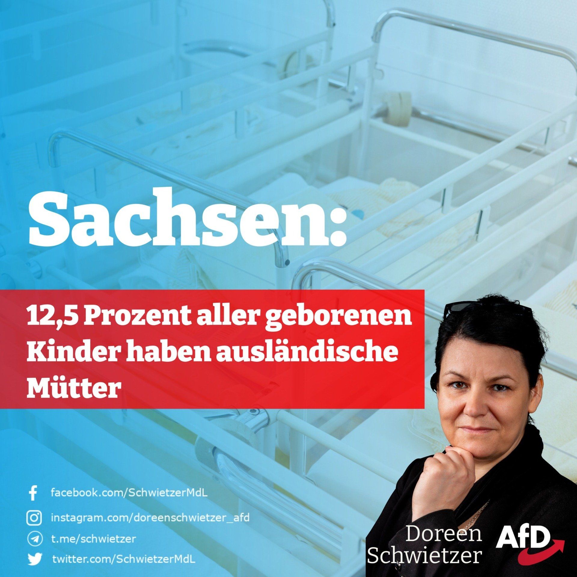 Laut meiner Anfrage (7/10822) ist Leipzig mit 18,5 Prozent Spitzenreiter und der Landkreis Erzgebirge mit 5,6 Prozent Schlusslicht. Mit 2,02 Kindern pro Frau haben Ausländer auch eine deutlich höhere Geburtenrate als Deutsche mit 1,49 pro Frau. Hauptsächlich kommen die Ausländer aus Syrien.