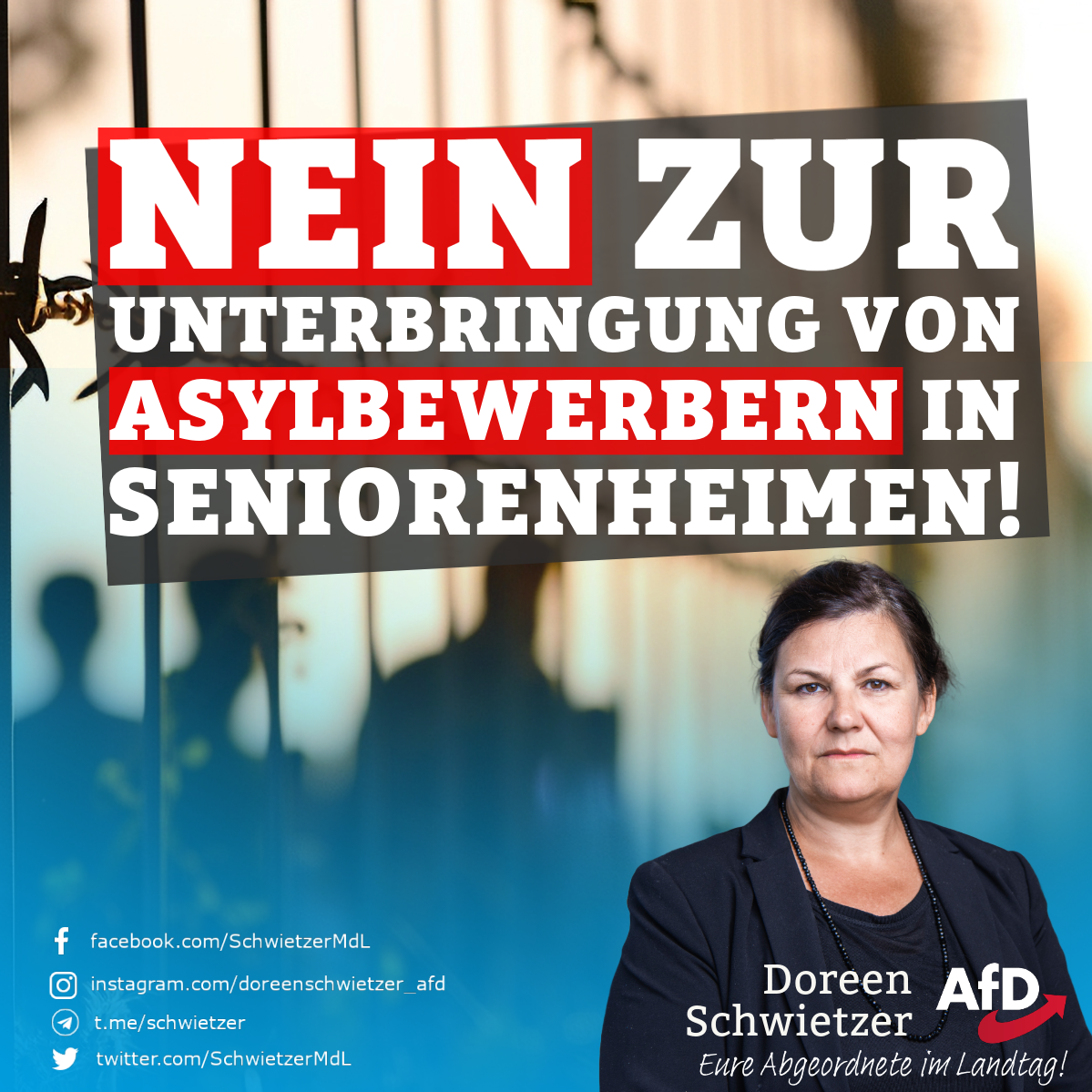 „Ich empfinde es als hochgradig unanständig, unsere Senioren vor die Tür zu setzen, weil sich mit der Betreuung von minderjährigen Ausländern mehr Geld verdienen lässt. Wir wollen daher die Unterbringungsstandards deutlich senken, damit auch diese Gruppe separat in normalen Asylheimen wohnen kann.